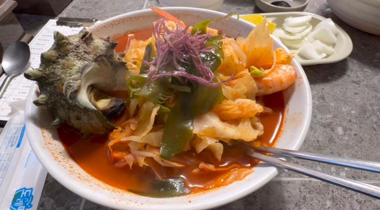 꼭 먹어봐야 한다는 해물 짬뽕을 시켰다. 일단 비주얼부터가 달랐다. 역시 가파도 답게 큰 소라가 떡하니 올라와 있는 것에 이 해물짬뽕의 이름값은 한 것 같다.