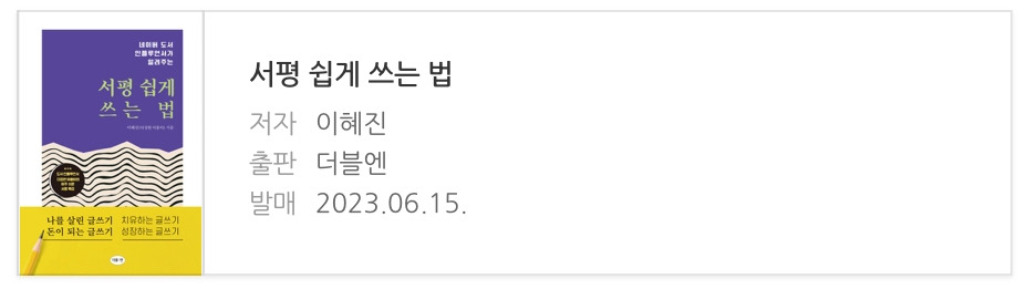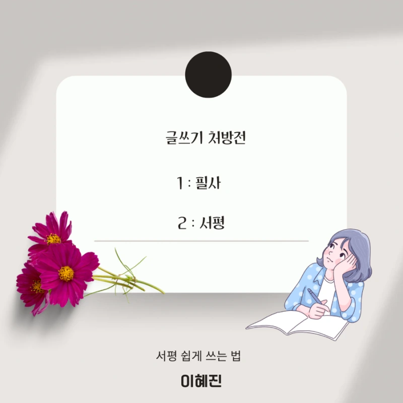 글을 쓰고 싶지만 아직 막막하고 어렵다는 생각에 주저하고 있는 독자들한테 이혜진 작가님은 두 가지 처방을 내려주신다. 첫 번째는 무조건 필사이고 두 번째가 바로 서평 쓰기란다.