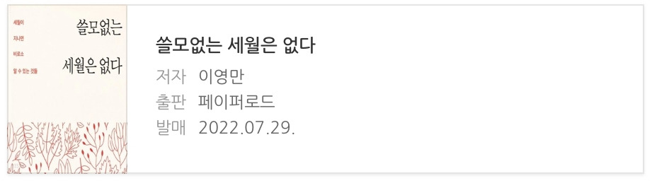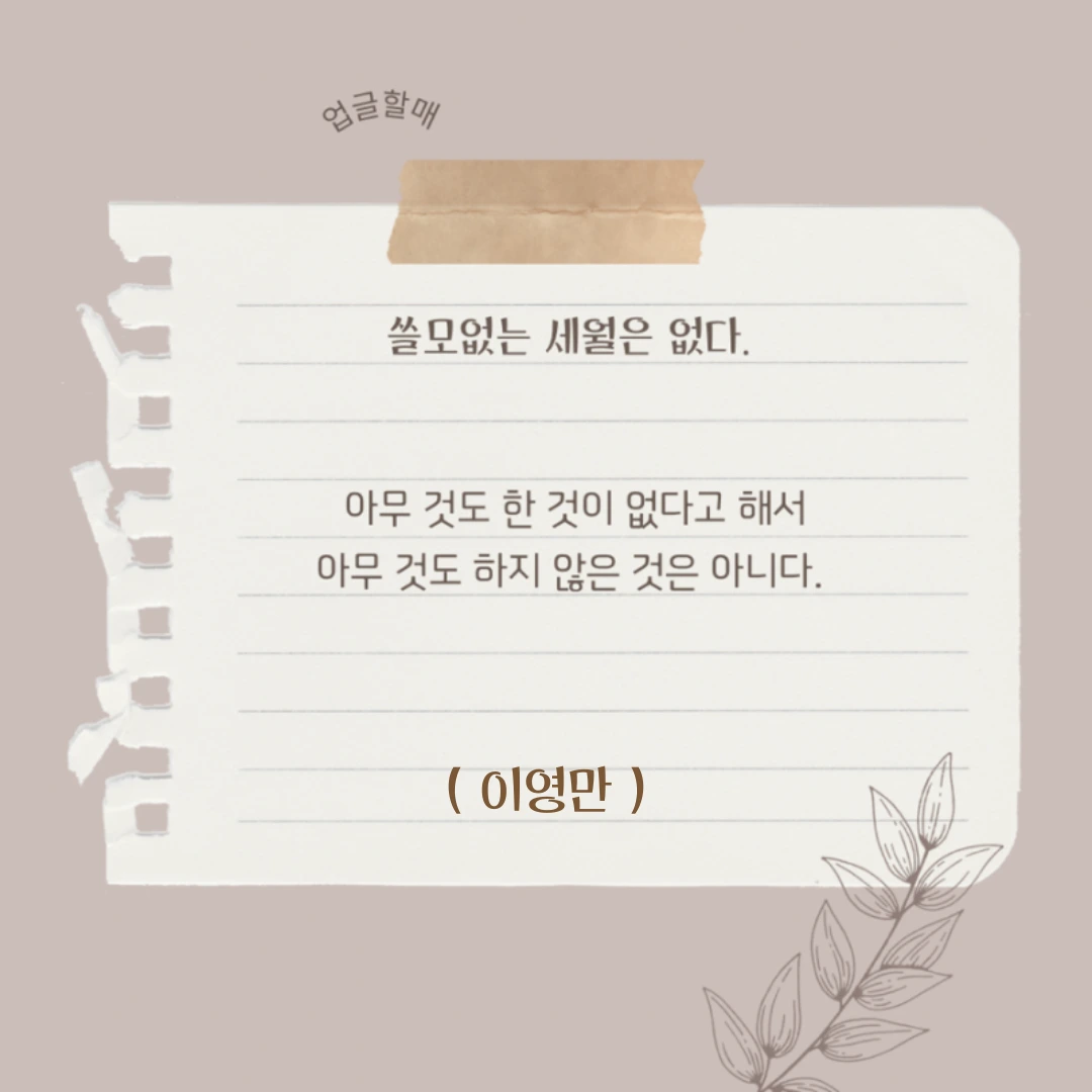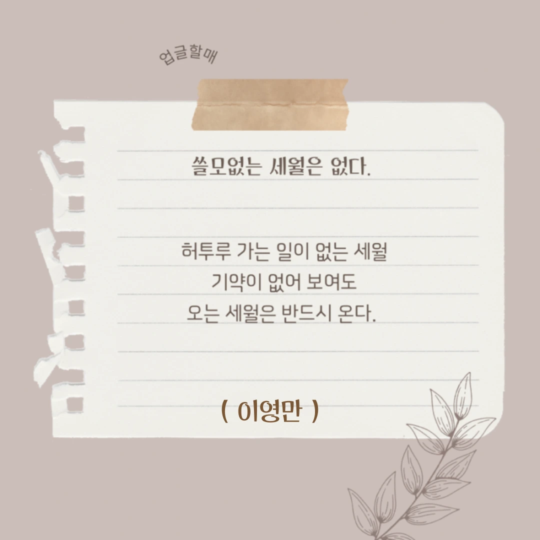 때로는 아무것도 한 게 없다는 자책감에 괴로운 생각이 들면서, 인생을 헛 산것 같은 허무감에 사로잡힐 때 , 《 쓸모없는 세월은 없다 》 이 책이 따뜻한 위로가 될 것이라고 작가님은 희망의 메시지를 주신다.