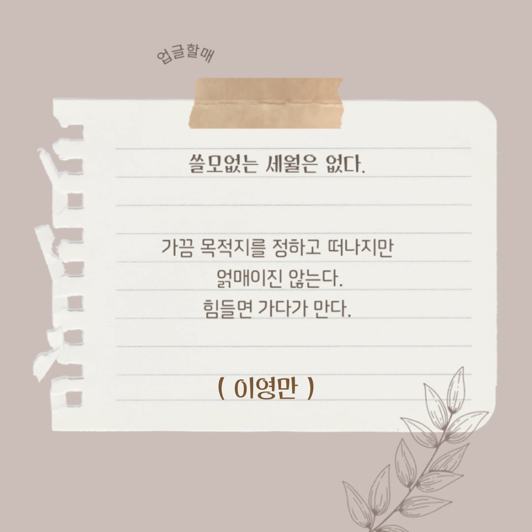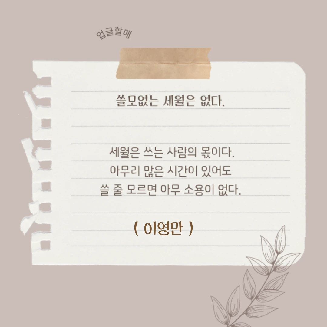 세월은 쓰는 사람의 몫이란다. 아무리 많은 시간이 있어도 쓸 줄 모르면 아무 소용이 없다는 이영만 작가님의 말씀에 무조건 한 표를 던진다.