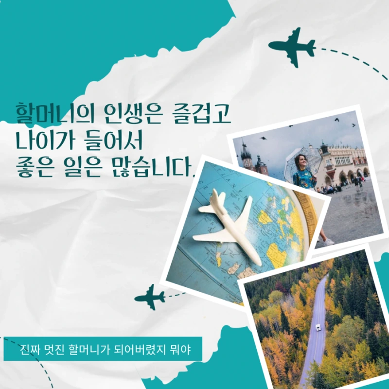 내 나이가 몇이라 해도, 노년이 되었다 해도, 인생이 끝난 것은 아니기 때문에 그래서 지팡이 대신 캐리어를 끌기로 하셨단다.