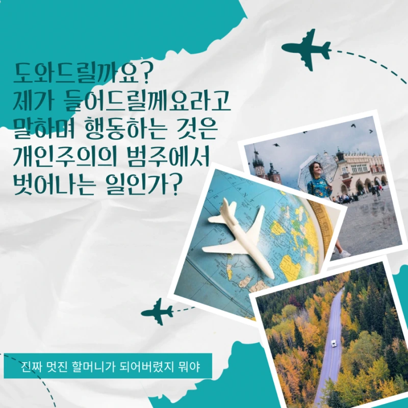 “도와드릴까요? ”, “제가 들어드릴게요"라고 말하는 것이 개인주의의 범주에서 벗어나는 것이라고 생각하고 있다면 그건 확실히 잘못된 개인주의 일 것이다.