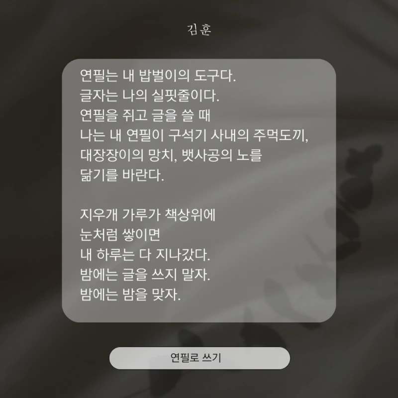평소에 너무도 존경하고 좋아하는 김훈 작가님의 “연필로 쓰기”의 명 문장을 김선영 작가님의 입장으로 바꿔 보신 것이다.