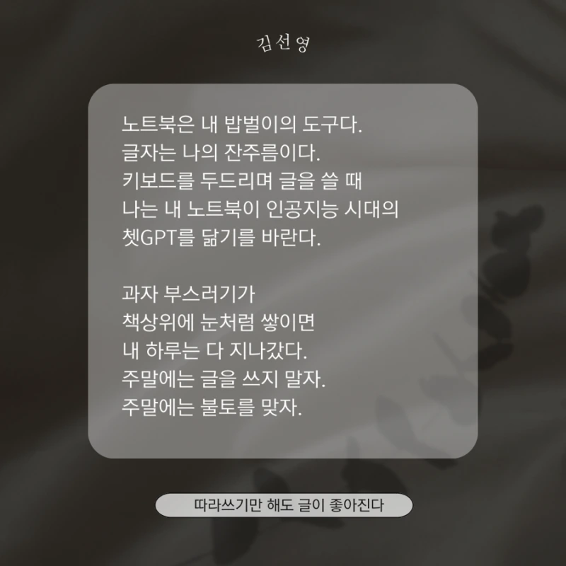 김선영 작가님의 말씀에 의하면 나도 잘 쓰고 싶다는 바람으로 필사를 한다고 한다.