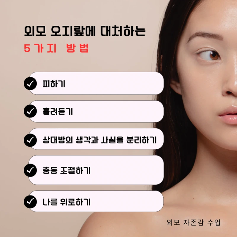 < 외모 자존감 수업 >에서 가르쳐 주시는 외모 오지랖에 대처하는 5가지 방법이다.