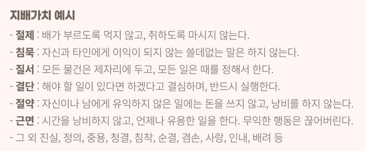 하지만 지배가치 예시를 보니끼 체계적으로 배우지는 않았어도 비슷하게는 살아온 것 같아서 어떻게 쓰면서 실천해 나가야하는 지만 열심히 배우다보면, 이것 또한 언젠가는 편안하게 할 수 있는 날이 올 것 같다.