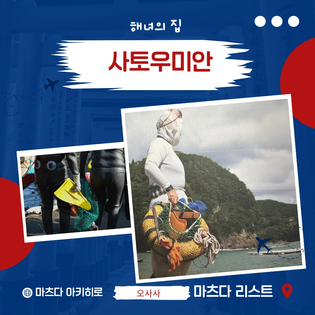 일본 미에현의 시마라는 곳에 작은 오두막에서 해녀들이 직접 잡아온 조개를 해녀들이 일일이 설명을 해주면서 직접 구워주는 아주 멋있고 맛있는 집이 바로 “사토우미안”이라고 한다.