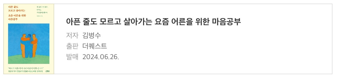 《 아픈 줄도 모르고 살아가는 요즘 어른을 위한 마음공부 》의 저자이신 김병수 작가님은 정신건강의학과 전문의이시며, 현재 “김병수 정신건강의학과 의원”의 원장님으로 활동을 하고 계신다.