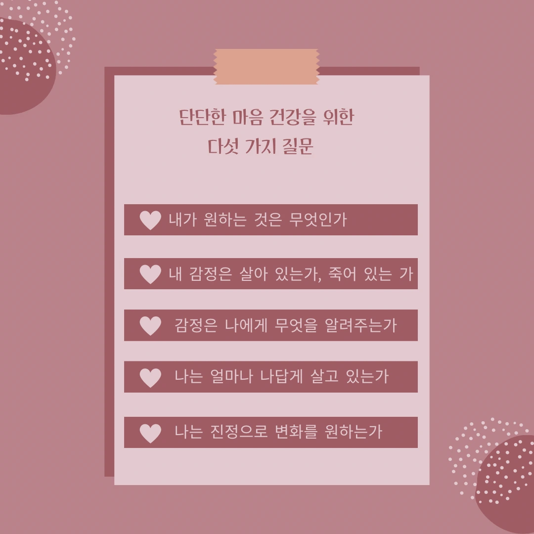 단단한 마음 건강을 위해서는 나한테 다섯 가지 질문을 해야 한다고 김병수 작가님은 말씀하신다.