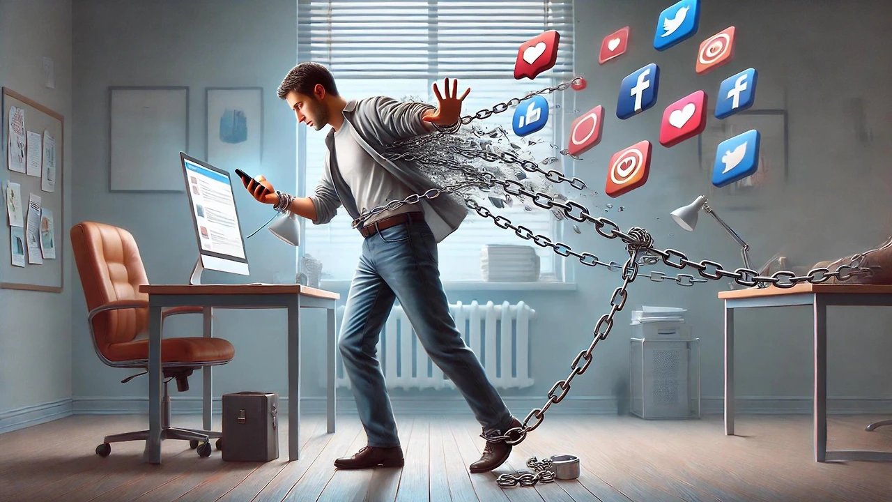 단호한 표정으로 손에 든 스마트폰을 멀리하면서, 각종 SNS 아이콘이 손목에 연결된 쇠사슬에서 떨어져 나가는 장면이다.