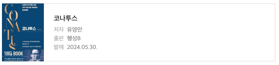 너무나도 좋아하고 존경하는 지식생태학자 유영만 교수님의 《 코나투스 》라는 100번째 책이 드디어 나왔다는 소식에 설레는 마음으로 책이 출간되기도 전에 미리 사전 예약이라는 것을 해 봤다.