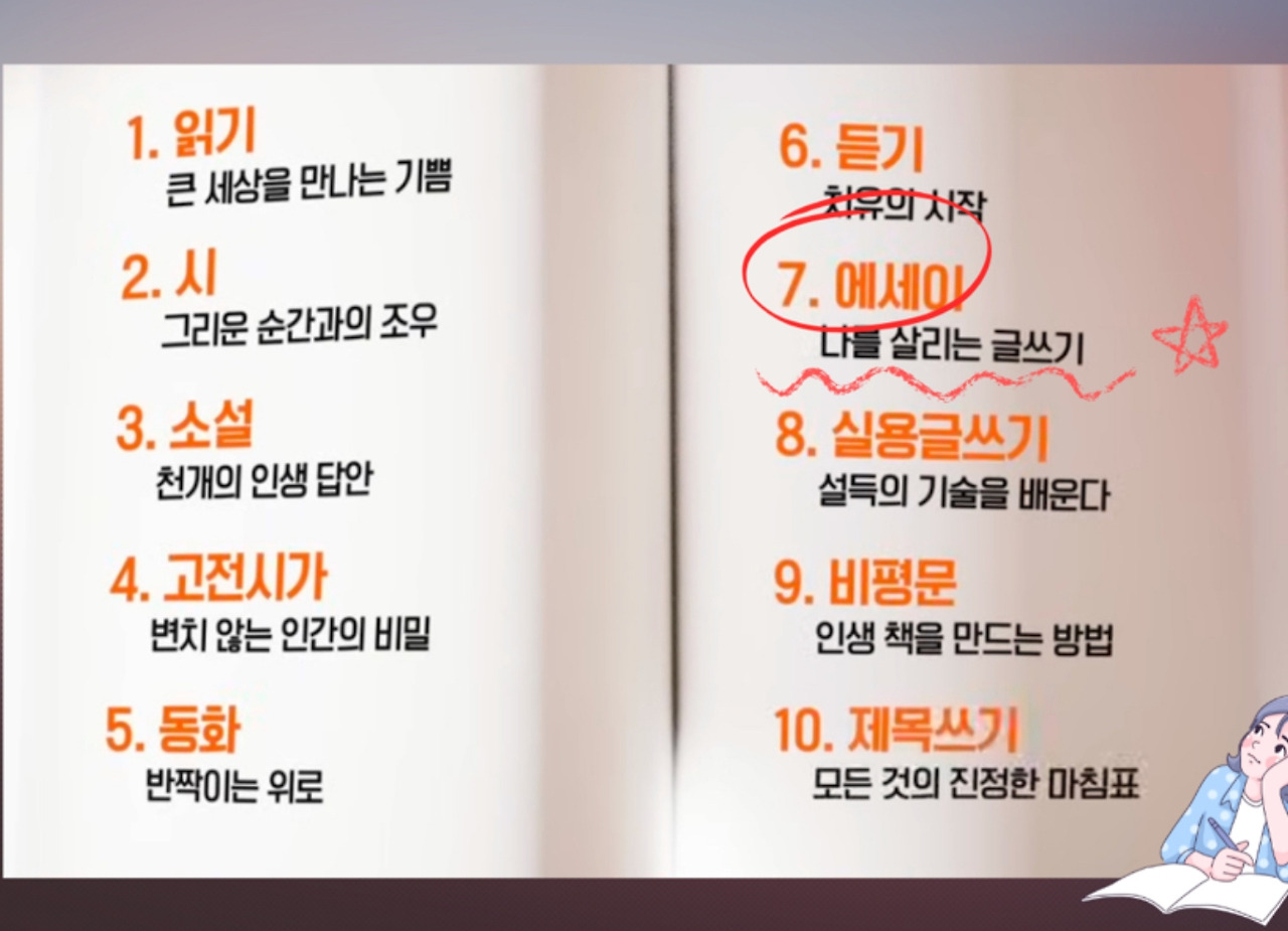 나의 두 번째 교과서 7강에서는 내가 그토록 오랫동안 기다려왔던 ‘나를 살리는 글쓰기’라는 제목으로 에세이에 대한 공부가 시작됐다.