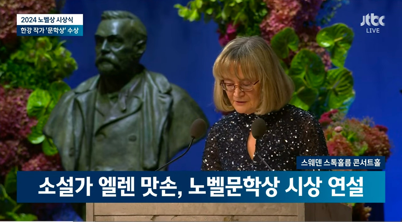 스웨덴 한림원을 대표해서 한강 작가님의 2024년 노벨문학상 수상을 진심으로 축하드립니다.’라고 연설을 마치면서, 이제 앞으로 나오시면, 스웨덴 국왕께서 증서를 수여하겠다는 안내 말씀 또한 함께 했다.