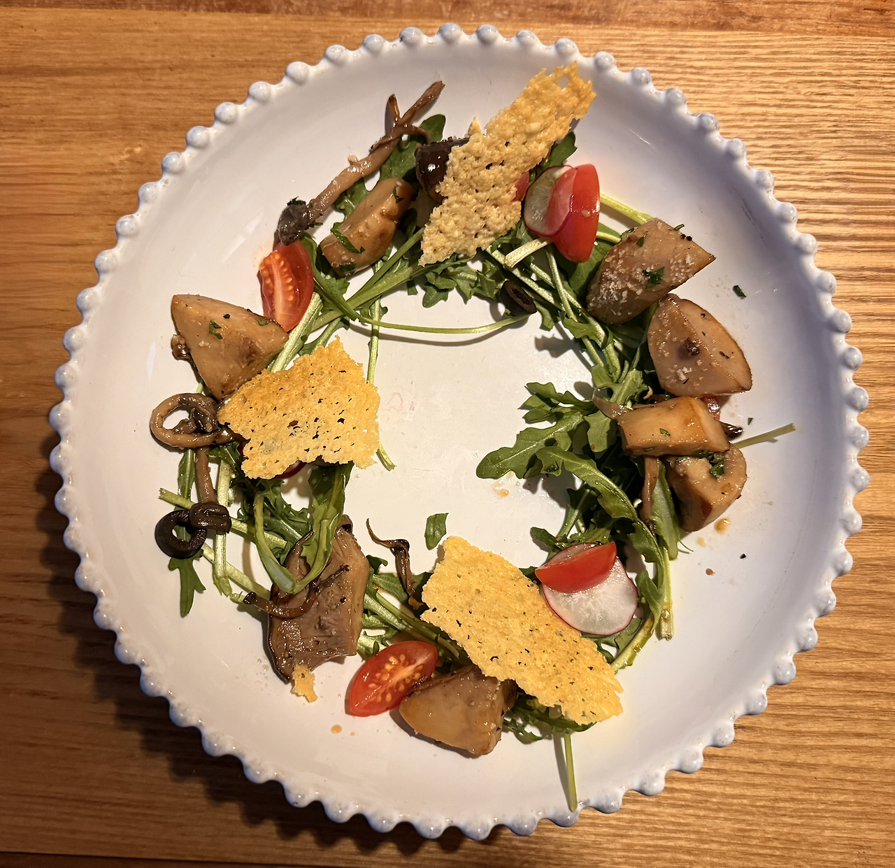 4가지 버섯이 오리엔탈 소스와 함께 어우러진 이 샐러드는, 양송이, 느타리버섯등 네 가지 버섯이 조화롭게 어우러진 곳에, 얇게 슬라이스해서 살짝 튀긴다음 치즈가루를 뿌린 색다른 누릉지가 함께 한다.
