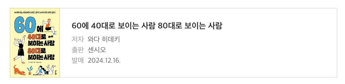 《 60에 40대로 보이는 사람 80대로 보이는 사람 》, 이 책에서 작가님은 의욕, 여유, 감정 전환, 기억력 등의 다양한 차원을 통해서 인간이 노화에서 승리하는 법, 감정 노화를 방지하는 법 등 구체적이면서 생생한 해결책 또한 알려주신다.