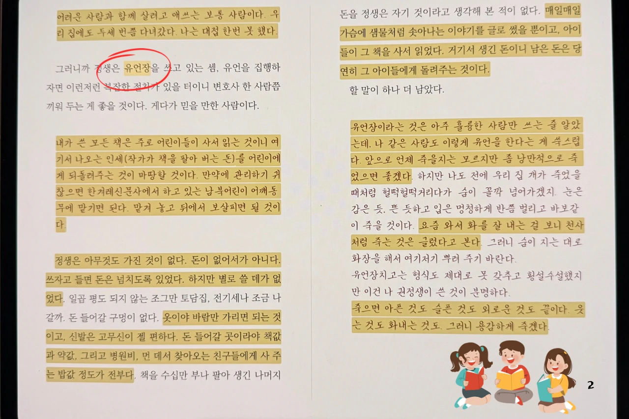 유언장이라는 것은 아주 훌륭한 사람만 쓰는 줄 알았는데, 나 같은 사람도 이렇게 유언을 한다는 것이 쑥스럽다는 작가님의 말씀이, 죄송스럽지만 귀엽다는 생각이 들어 피식 웃어본다.