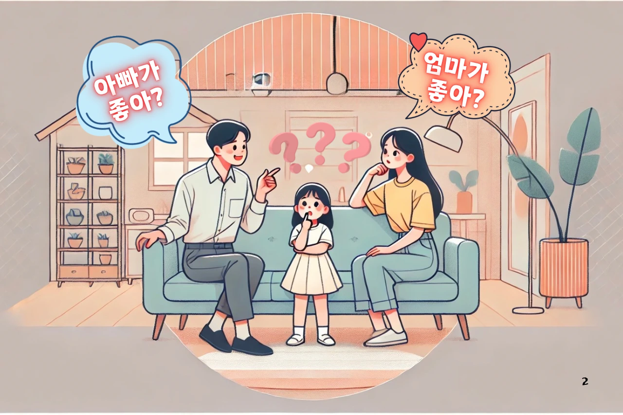하지만 요즘의 부모들은 참 많이 변했다. 비록 아이는 당황할지언정, 부모의 입장에서는 “엄마가 좋아? 아빠가 좋아?“라는 질문을 통해서 아이의 귀여운 반응도 보고, 아이와의 즐거운 추억을 쌓아가는 것이 더 중요할 정도로 여유들이 생긴 것이다.