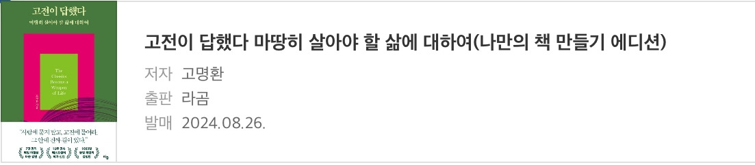 《 고전이 답했다 마땅히 살아야 할 삶에 대하여 》, 이 책은 작가님이 고전을 통해 얻은 삶의 통찰과 자신의 경험을 담은 에세이로, 예약 판매 하루 만에 베스트셀러 1위를 차지하며 큰 주목을 받았다.