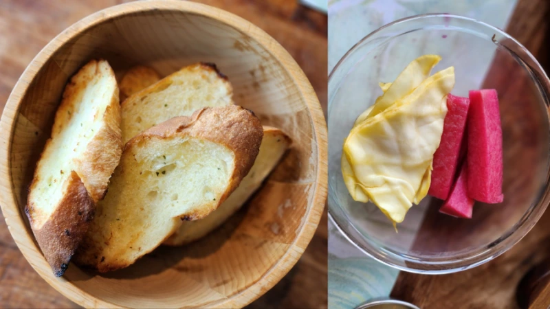 메인 음식이 나오기 전에 먼저 식전빵과 피클이 나왔다.이 식전빵이 또 희한하게 맛있다.사람 수에 맞춰서 나오는 것이라서 어떨 때는 조금 더 안 주나 하면서 두리번거리게 만든다.