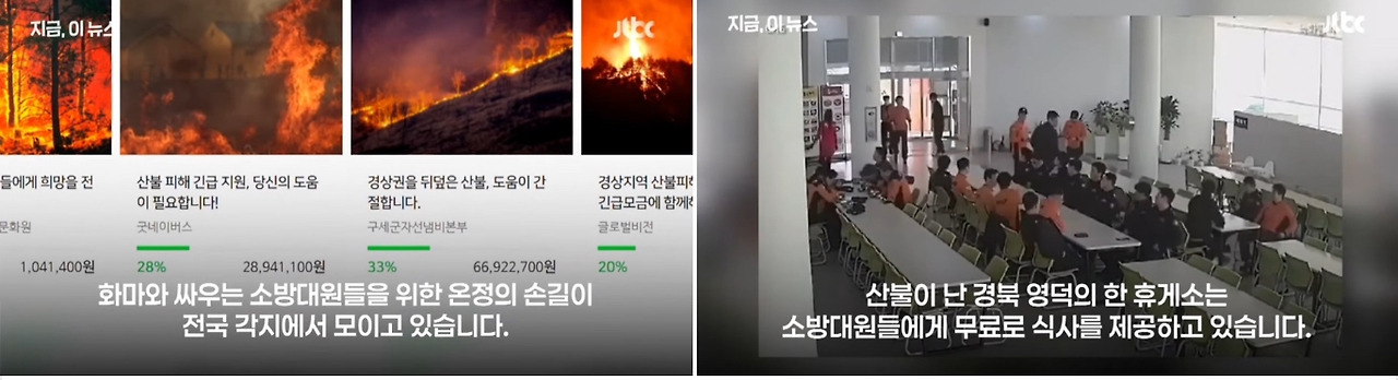 산불이 발생한 경북 영덕의 한 휴게소에서는 고생하는 소방관들을 위해 무료로 따뜻한 식사를 제공하고 있고, 근처에서 펜션을 운영하시는 분들은 언제든지 편히 와서 쉬다 가라며 기꺼이 숙소를 내어주고 있다고 한다.