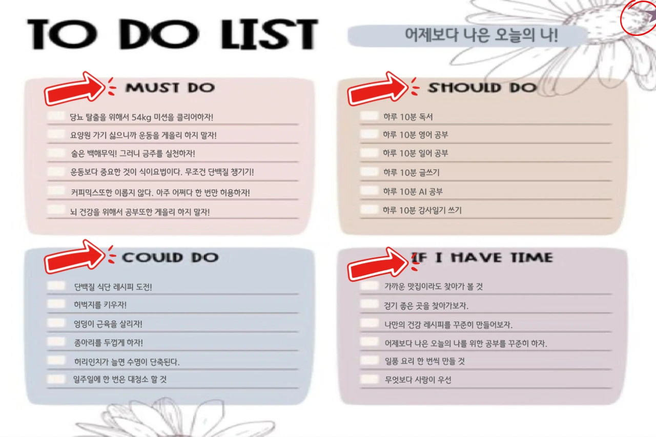 하루를 마무리할 때 “아, 이건 해냈다!”라는 뿌듯함을 줄 수 있는 핵심 과제들이 들어간다.