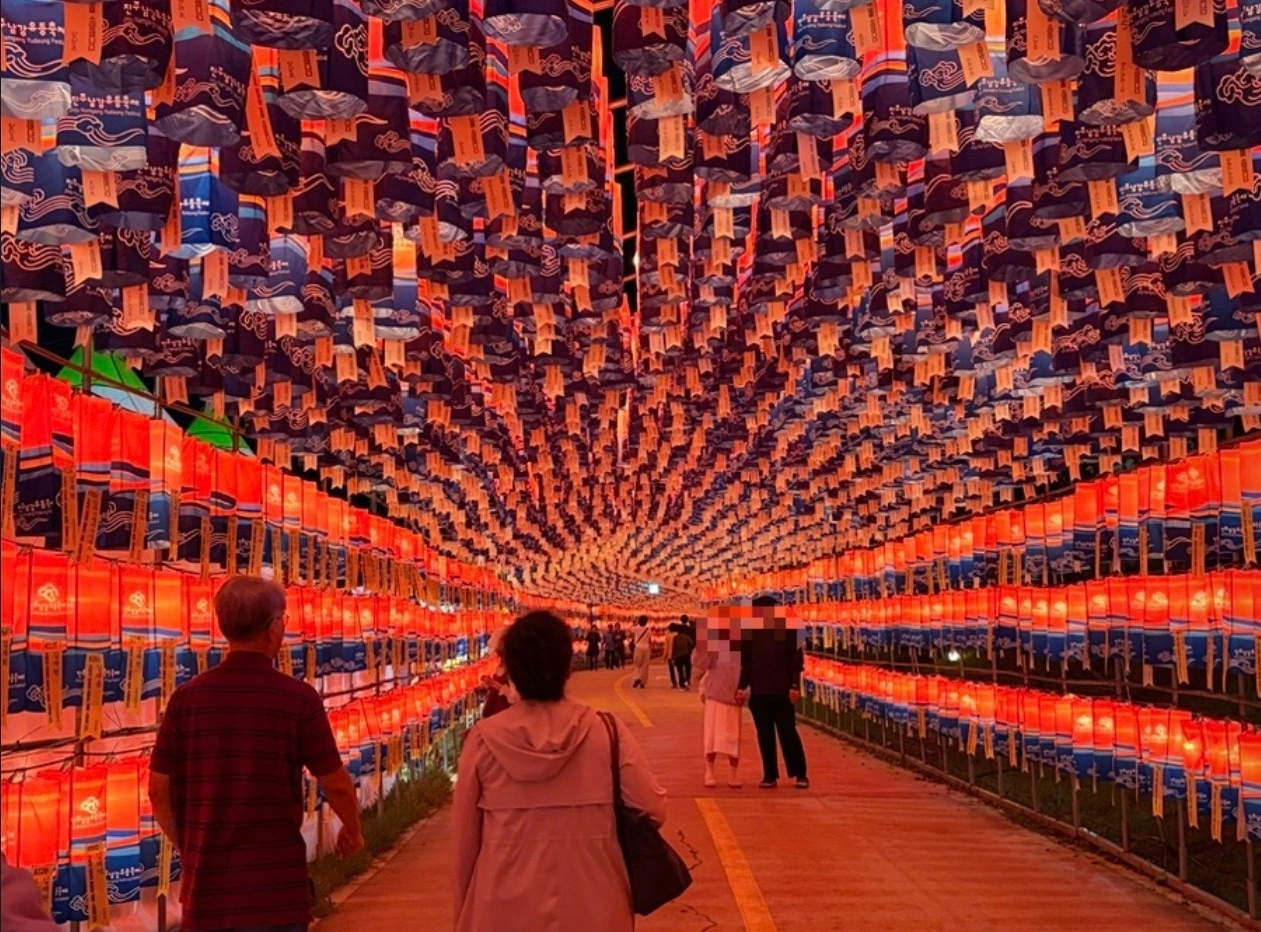 머리 위로 끝이 보이지 않을 만큼 빽빽하게 매달린 수천 개의 등이 한꺼번에 불을 밝히자, 세상이 온통 붉고 푸른빛으로 물들은 것 같다.