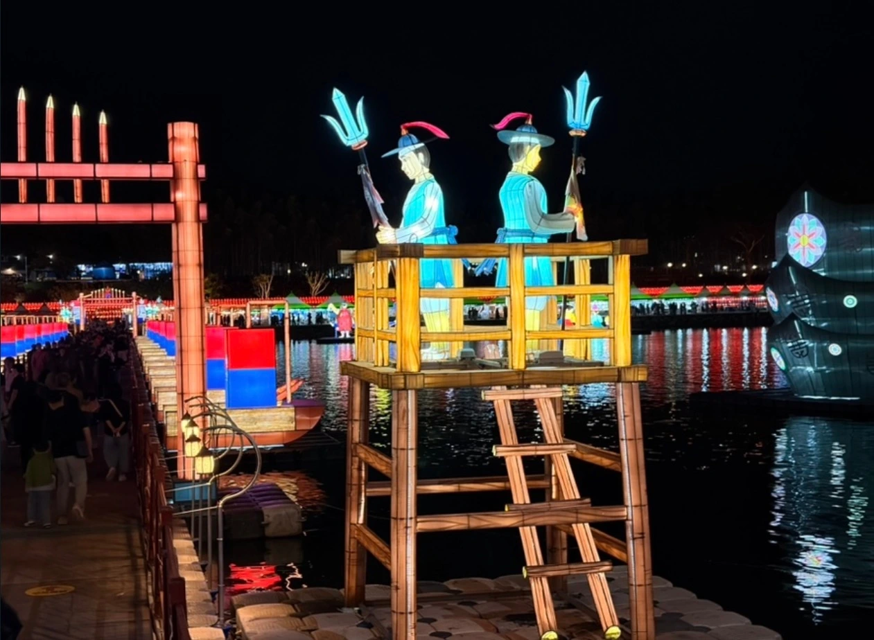 남강 위로 떠오른 불빛 조형물들 사이에서, 한 장면이 눈길을 사로잡았다.