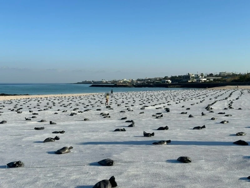거의가 모래가 날아가지 않도록 비닐 천을 덮는다.