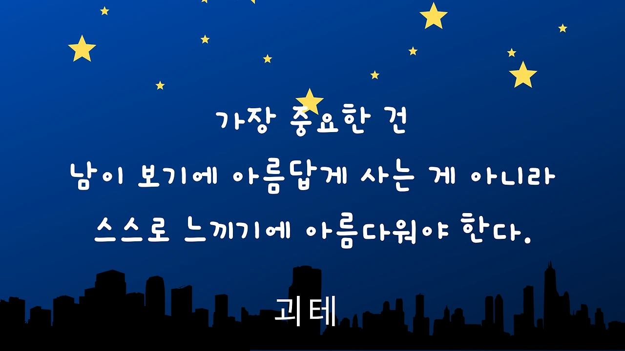 가장 중요한 건 남이 보기에 아름답게 사는 게 아니라 스스로 느끼기에 아름다워야 한다는 말처럼 내가 나를 아름답다고 여기는 것이 가장 중요한 것 같다.