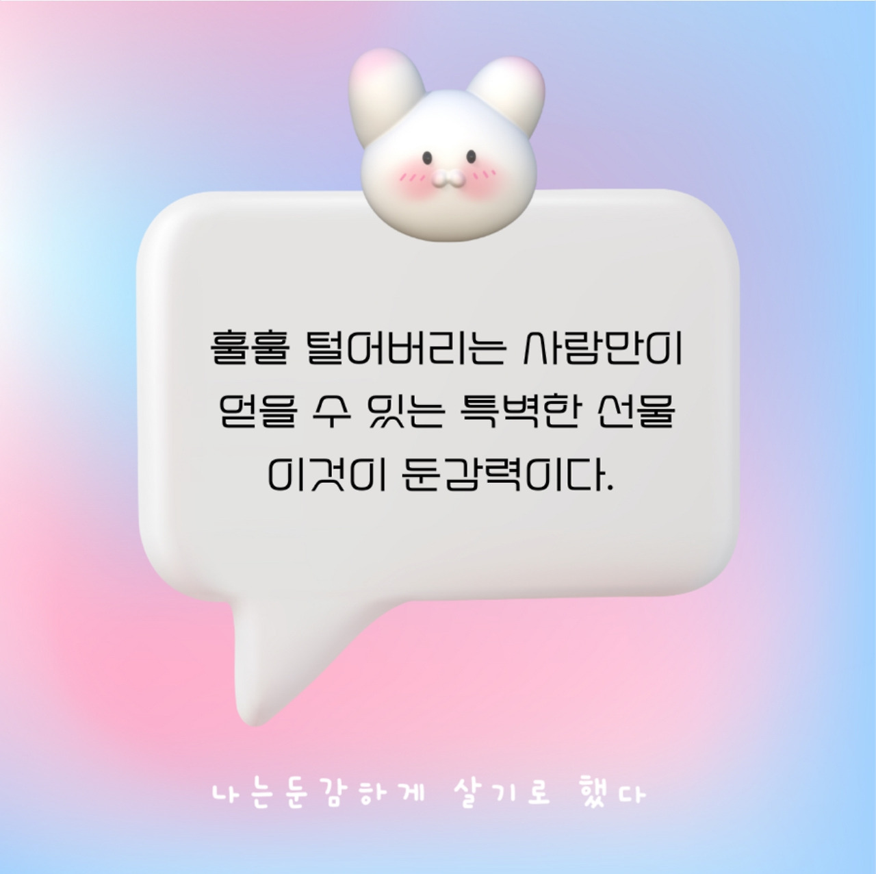 《 나는 둔감하게 살기로 했다 》의 와타나베 준이치 작가님은 좋은 의미의 낙천주의가 긍정적인 마음과 강인한 둔감력을 키워준다고 하신다. 지금은 강력한 둔감력 없이는 살아가기 힘든 시대이니만큼 우리 모두 제대도 된 둔감력을 키워나가자.