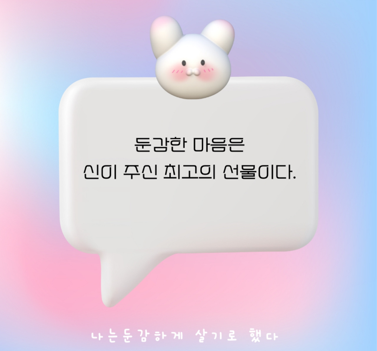 속상한 일이나, 억울한 일이 생겼어도 매사에 너무 예민하지 않고 아무렇지도 않게 넘어갈 수 있다는 둔감한 마음은 확실히 신이 내려주신 선물인 것 같다. 아무리 둔감해지려고 노력을 해도 죽어도 안 되는 사람이 있는가 하면 또 어떤 사람은 별다른 노력조차 안 하는 데도 매사에 속 터질 정도로 지나치리만치 둔감한 사람도 있다. 그래서 이런 것을 두고 하늘이 내려주신 선물이라고 하나보다.