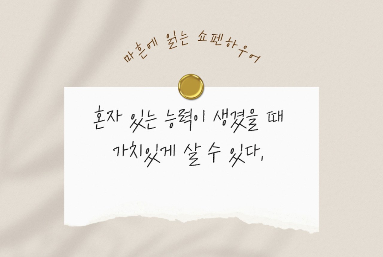 혼자 있는 능력이 생겼을 때 가치있게 살 수 있단다. 쇼펜하우어의 말에 의하면 지적인 능력이 클수록 혼자 지내려는 경향이 강하고 지적 능력이 떨어질수록 어울리는 경향이 강하다고 한다.
