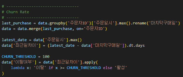 각 회사마다 정의가 다릅니다. 저희는 ‘N일 동안 구매가 없으면 이탈’로 정하고, 활성/비활성 고객을 나눴습니다. 자사 브랜드 이탈 날짜를 따라 CHURN_THRESHOLD = '' 값을 변경하시면 됩니다.