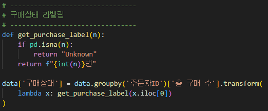 고객 한 명이 몇 번이나 재구매했는지 계산합니다. “3회 이상 재구매한 고객은 몇 명일까?” 같은 질문에 답할 수 있죠.