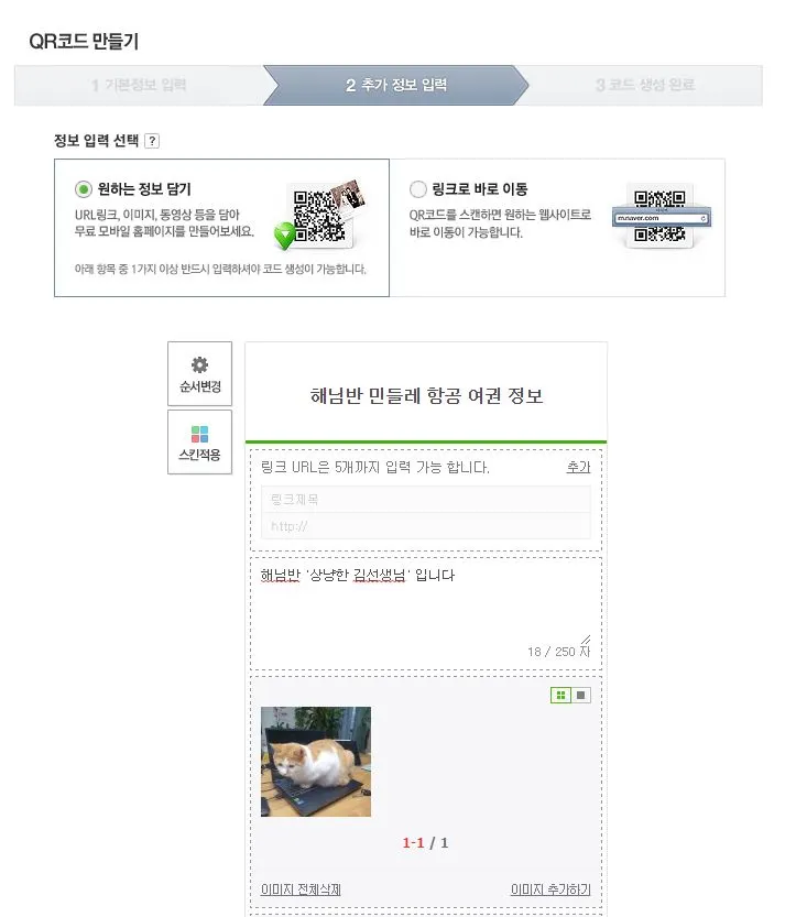 2. 다음 단계로 넘어가면 링크, 설명, 이미지 등을 넣을 수 있는 칸이 나옵니다. 아이 개별로 이름과 간단한 설명자료( 해님반 상냥한 김선생님 입니다)를 입력합니다. 그다음 이미지를 넣어요. 그러고 나서 다음을 눌러 줍니다.