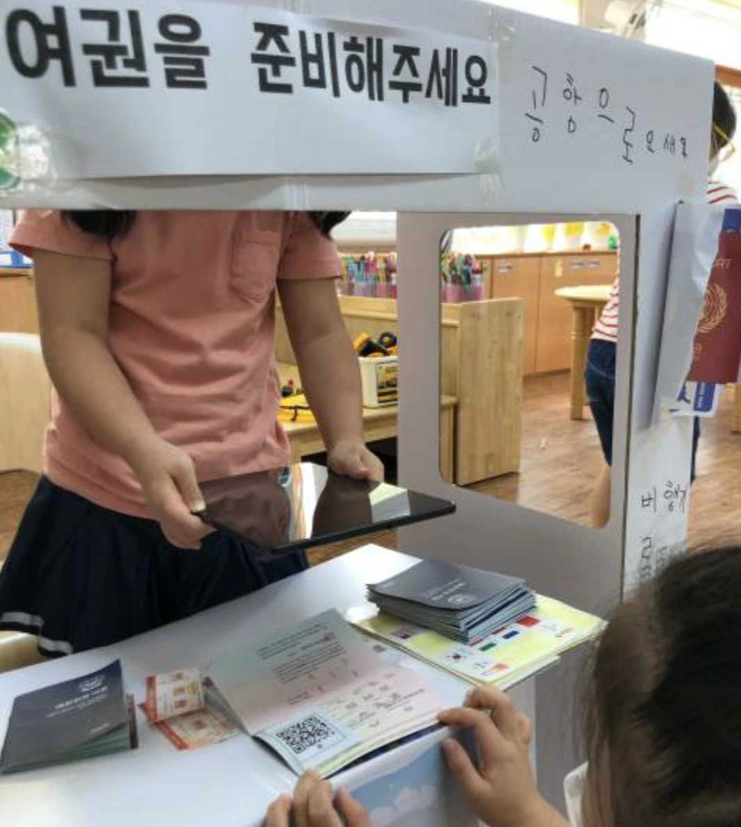 유치원에서 세계 여러 나라 주제를 이어가다 보면 한번쯤은 공항 놀이를 하게 됩니다. 그쵸? 비행기는 유아들이 좋아하는 소재이고, 비행기를 타러 공항으로 가서 검색대에 서보는 일도, 스튜어디스와 스튜어드, 조종사, 엔지니어 등 역할놀이도 신나게 참여합니다. 의자들을 모아서 줄을 만들어 놓고 종이판을 칠해 비행기 날개도 만들어봅니다. 비행기 조종사가 인터폰맨의 도움을 받는 것도 알고 있어요. 비행기가 제 위치에 설 수 있게 도와주는 역할을 하는 직원을 인터폰맨이라고 한데요. 대단하죠? 저도 몰랐던 사실까지 알려주는 아이가 있어요. 또 공항에서 여러 가지 물건을 사봤던 아이의 이야기를 듣고 나면 공항 놀이가 풍부해집니다. 공항에 한 번도 가보지 않았던 아이들도 잘 참여하죠. 꼭 비행기를 타보고 싶다고 말하면서요. 짐을 맡기는 곳을 세우고, 여권도 만들어야 하고, 비행기표도 만들어야 하죠. 공항 놀이를 시작하면 꽤 할 일이 많답니다. 오늘은 그중에서 여권을 만들 때 QR 코드를 미리 입력해서 체크인하도록 하는 방법에 대해 알려드릴까 합니다. 개별 여권을 만들 때 QR코드에 이름과 사진의 정보를 담아 미리 작성해서 붙여둡니다. 자기가 만든 여권을 들고 체크인을 하러 가서 태블릿에 비추면 정말 자기 얼굴과 이름이 담긴 페이지가 나와서 실제처럼 체크인하는 기분이 들어요.