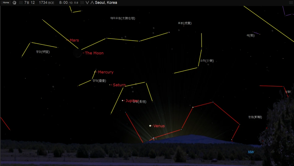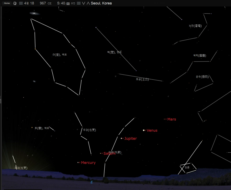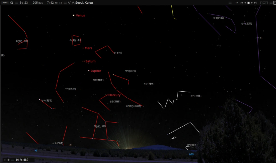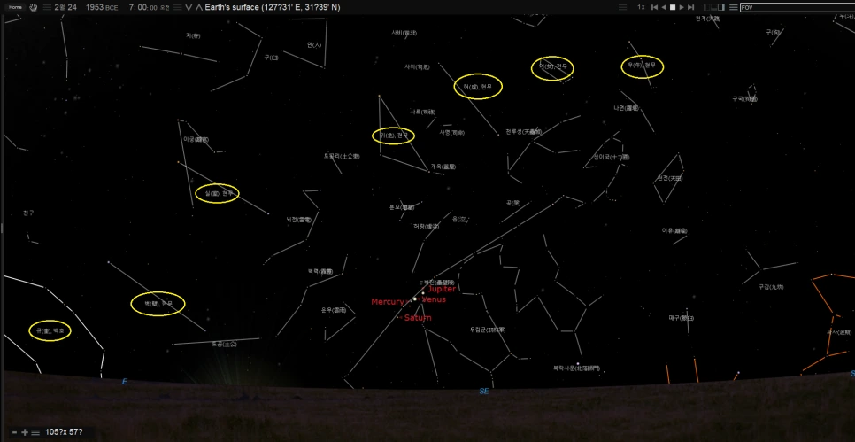 과연 잘 알려진 기록을 뒷받침하면서 일렬로 배열되는 모습을 확인할 수 있었다. 한서 고제기의 경우 행성들의 가장 동쪽에 정(井) 수가 있는 것이 확인되나, 실제 행성들은 오히려 귀(鬼)수 근처에 있어 보여 차라리 오성취귀라고 해도 될 것 같다.