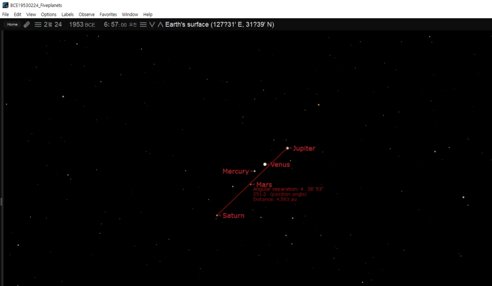 기원전 1953년 오성이 최소 거리로 밀집되었을 때 모습