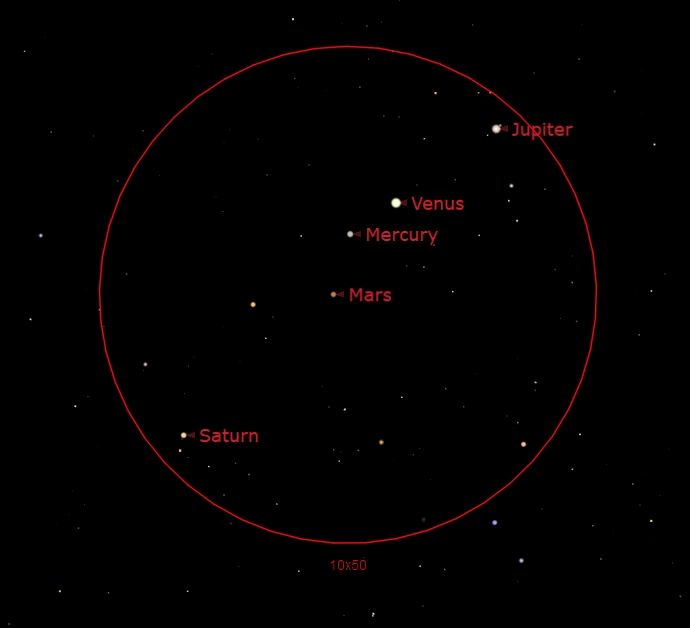 이게 얼마나 좁은 거리에 모여있는 거냐면 위의 그림처럼 10배율의 쌍안경으로 보아도 한 시야에 5개 행성이 모두 보일 정도이다. 전천 하늘을 맨 눈으로 보게 되면 동쪽에 해가 뜨기 직전에 5개의 별이 오밀조밀 모여 있는 모습이 보였을 것이다. 기간도 2월 말의 겨울이었기 때문에 동이 트기 전 오랜 시간 동안 볼 수 있었다.