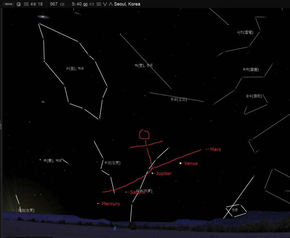위 그림은 967년 송나라 건국 시기에 오성이 규(奎) 별자리 근처에 '드문드문' 모인 모습이다. 이것을 다른 책도 아니고, 지금으로 치면 초등학생 도덕교과서인 '동몽선습'에 '송태조입국지초 오성취규(宋太祖立國之初 五星聚奎)' 라고 나와 있다. 같은 논리라면 저 그림의 오성은 '규(奎)' 모양으로 모인 것인가?