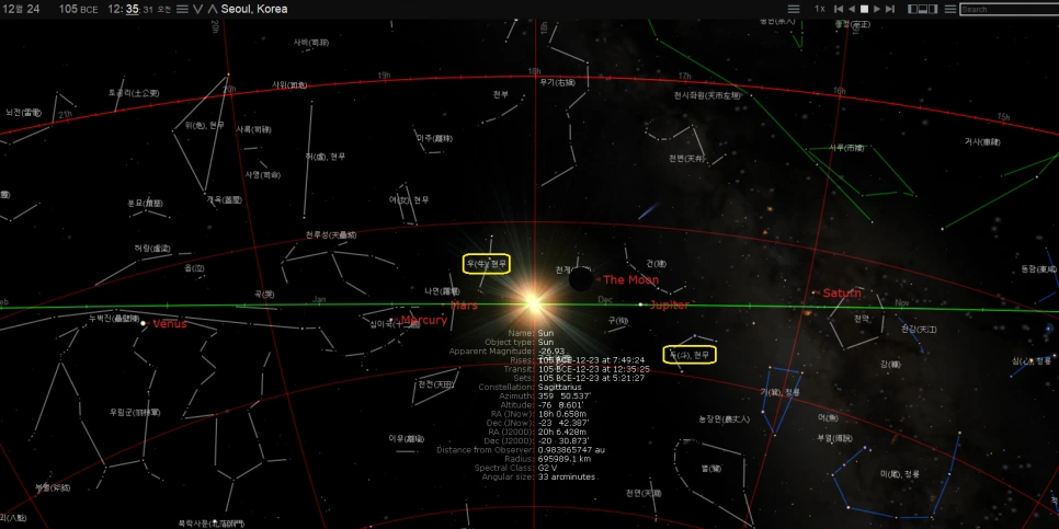 상단의 시각은 동경 시각이기 때문에 중국 시각으로 보면 11시 반-12시 즉 자시(子時)에 태양이 동지점에 들어갔고 달도 바로 옆에 있어 삭(朔), 즉 초하루인 것도 보인다. 오성이 구슬처럼 꿰어 있다는 말은 단순히 일렬로 늘어져 있는 것이 아니라 태양을 중심으로 좌우에 포진하여 구슬을 꿴 목걸이 같은 형상을 말한다. 이 모습은 태양이 있는 낮에는 당연히 확인할 수 없고, 저녁 서쪽하늘과 다음날 새벽 동쪽 하늘의 모습을 보면서 짜 맞추어 볼 수 있었을 것이다.