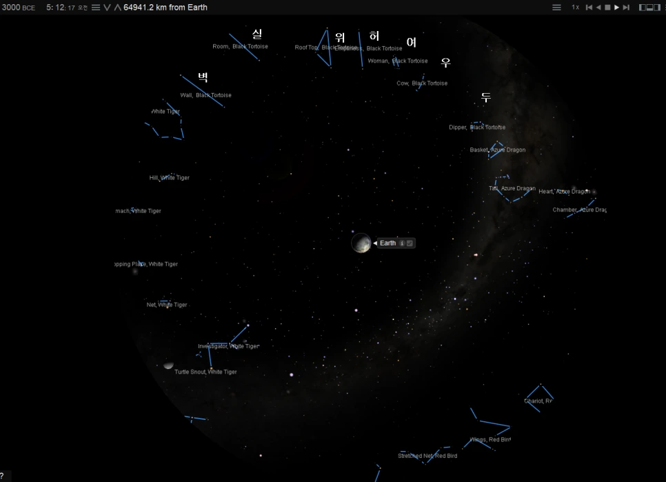 실제 28수 별자리들의 위치를 하늘의 북극에서 들여다보자.