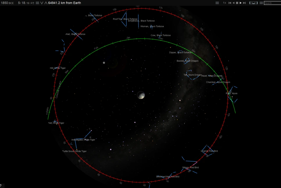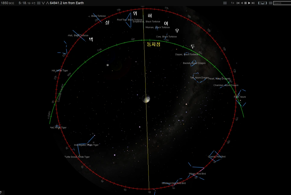 바로 위 그림의 모습이 서경 요전에서 언급하는 고대 동양의 역법에서 적도 경도의 기산점이 되었던 동지의 모습이다. 공교롭게도 흔히 단기 원년으로 보는 기원전 2333년과 비슷하게 맞물려 있기도 하는데, 단군기원이 요임금 즉위 25년 후라고 하니 비슷하다고 볼 수 있겠다.