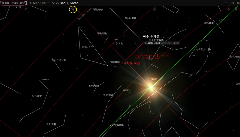 허수의 수거성, 즉 기준이 되는 별은 '사달 수드'라는 물병자리 베타 별이다. 이 별에서 동쪽으로 정확히 6도 떨어지는 지점을 동지점, 즉 적경 18h 선이 통과하고 태양이 이곳에 위치했을 때를 찾아보니 아래와 같았다.