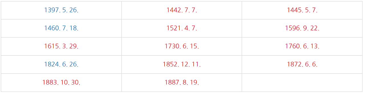 조선시대를 통틀어 한반도를 달의 본그림자가 지나간 것은 아래와 같이 대략 14회 정도 된다.