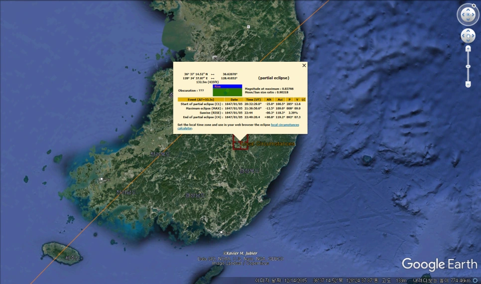 1647년 1월 5일 (음력 1646년 12월 1일) 일식 (출처 : Google earth)