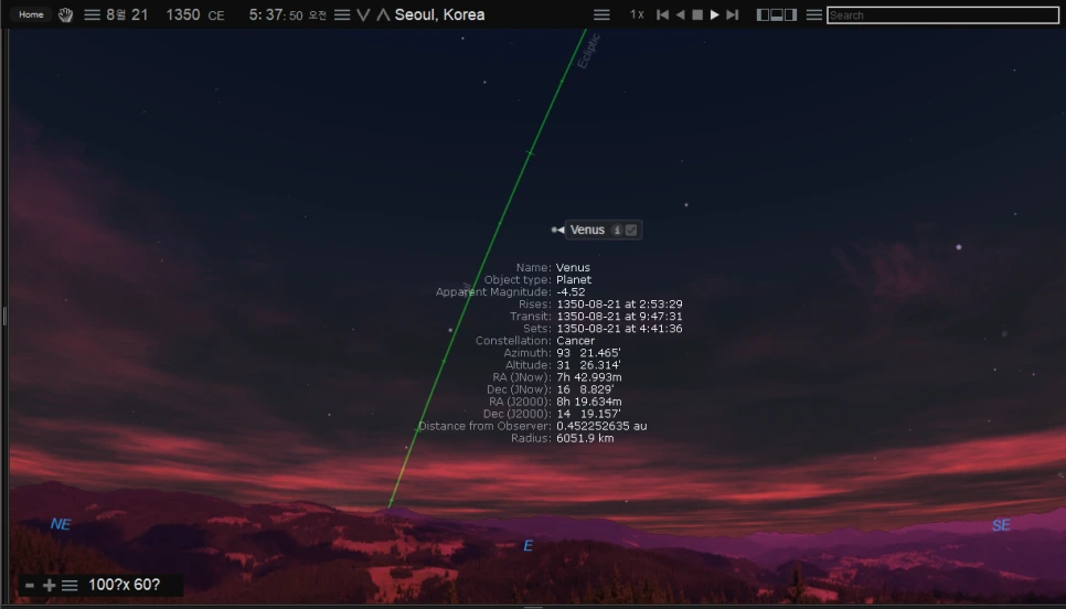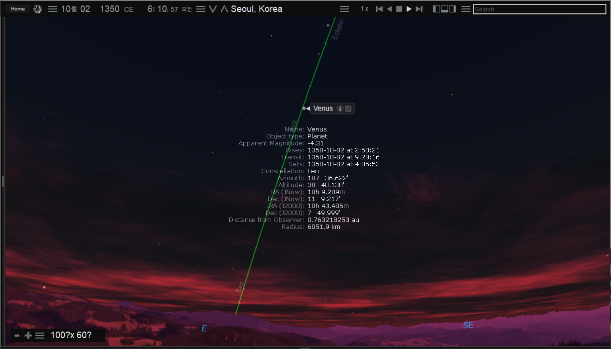 1350년 음력 9월 1일 계축일은 양력 10월 2일이다. 이 때도 태백 주현이라는 말이 있다. 기록이 듬성듬성 있지만 7월과 9월에 금성이 낮에 보였다는 기록을 연결지어 보면 2개월의 시간동안 낮에 별이 보였다는 것으로 해석할 수 있다. 그렇다면 이 때 태백인 금성은 어디에 있었는지 플라네타리움 소프트웨어로 검증해 보았다.