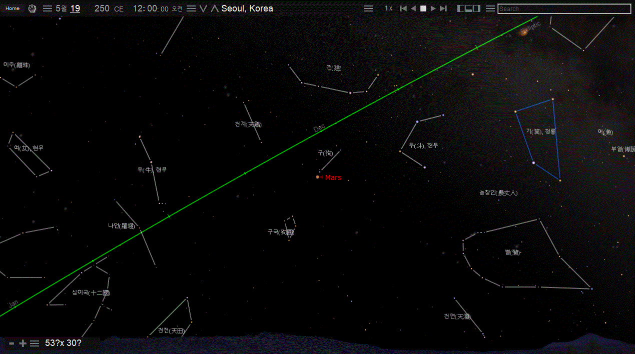 왕릉의 난이 일어난 250년의 모습과 거의 동일하게 화성이 남두(南斗) 별자리로 역행하여 들어가는 모습을 볼 수 있다.