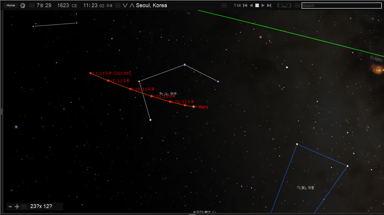 화성이 두수의 국자 모양의 네 별 안으로 진입하는 시기는 7월 13일(음력 6월 16일)이며, 일주일 뒤인 7월 20일(음력 6월 23일) 이후로 완전히 자리를 잡는 모습을 보였다. 바로 이때인 인조 1년 6월 23일에 다음과 같이 실록에 기록이 있다.