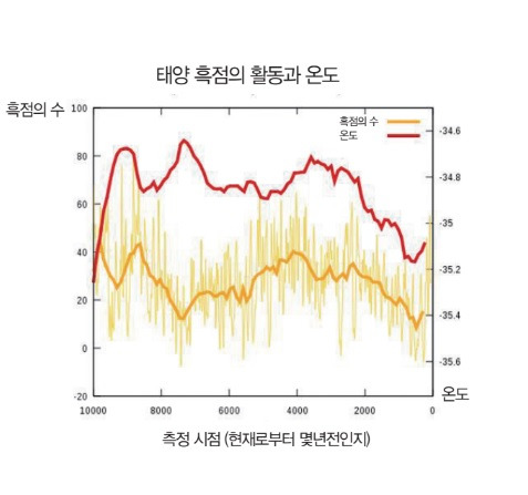그런데 역사 기록을 되돌아보면 앞서 소개한 영화 '선샤인'에서처럼 태양으로부터 오는 복사 에너지가 한결같지 않을 수도 있다는 생각이 든다. 선샤인의 엔딩장면은 구름이 한점 없는 대낮이지만 하늘은 마치 해가 지는 저녁을 연상할 정도로 어둡다.